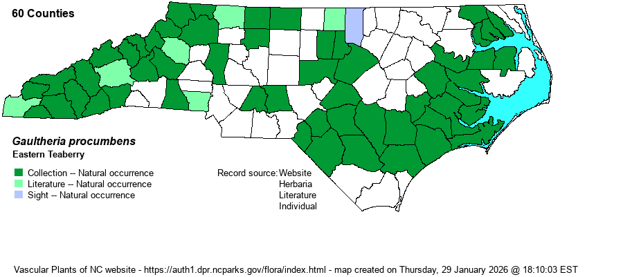 | Identification | This is another very low-growing “shrub” barely reaching a few inches tall, with only a few leaves per plant. If the red berry or the small white urn-shaped flowers can be seen, the species is easy to identify. However, the fairly typical elliptical, thick and shiny, evergreen leaves, growing about 1-1.5 inches long, can be mistaken for seedlings of other evergreen species, such as several holly species and especially Mountain Laurel – even though Teaberry almost always has tiny teeth on the leaf margins. If in doubt, break or tear a leaf and smell it; the species has a fragrant odor of wintergreen (an alternate common name). Field workers are quite familiar with both this species and Trailing Arbutus, and both can be found in the same places, though the arbutus is more widespread in the Piedmont. | |