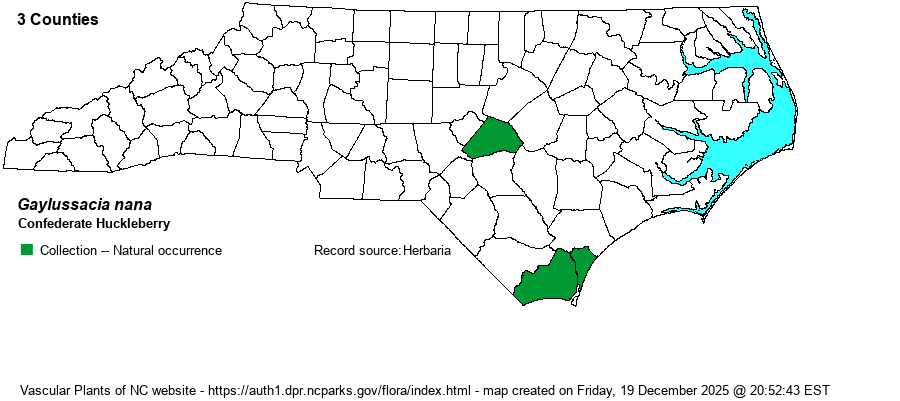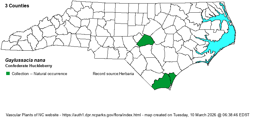 | Distribution | Limited, as far as known, to just a few sites in the southeastern corner of the state (Brunswick and New Hanover counties). There also is a specimen at NCU from Harnett County, collected in 1996 on Fort Bragg; it was verified in 2021. Assuming that there is no error in the location data, we accept this record.