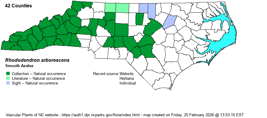 | Habitat | Throughout most of its state range it is limited mainly to the banks and shorelines of rocky forested creeks, less so along other forested riverbanks. In the Sandhills, it occurs on indurated clay banks. It also can be found in bogs and swampy areas, mostly in the Mountains. Also, on rare occasions it occurs in heath balds and other rocky forests. Unlike many other azaleas, it seldom grows in colonies or sizable stands; often only a few plants are present. | |