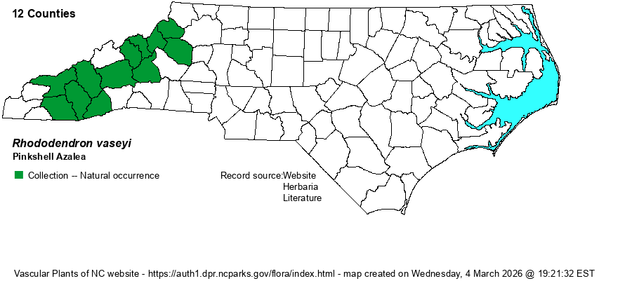 | Identification | This is a somewhat unique shrub, even though it occurs in a genus of many other shrub species. Though it is a deciduous species of “azalea”, its flowers have only a short floral tube and thus the flowers are mainly widely spreading from the base; there are 5-7 stamens instead of 5 for the other azalea species. It grows up to 15 feet tall, though it averages around 5-6 feet tall. It has considerably larger leaves than the other NC azaleas, and lengths average 3-4 inches long instead of perhaps just 2-2.5 inches long; they also tend to be more elliptical than in other azaleas. Even so, most people will easily overlook this shrub in leaf; the soft rose-pink flowers with quite long stamens are generally needed for identification. The species can often be seen along the Blue Ridge Parkway at high elevations, when in late May and early June the large pink flowers will command attention, such as at Grandfather Mountain and in the Great Balsam Range. | |