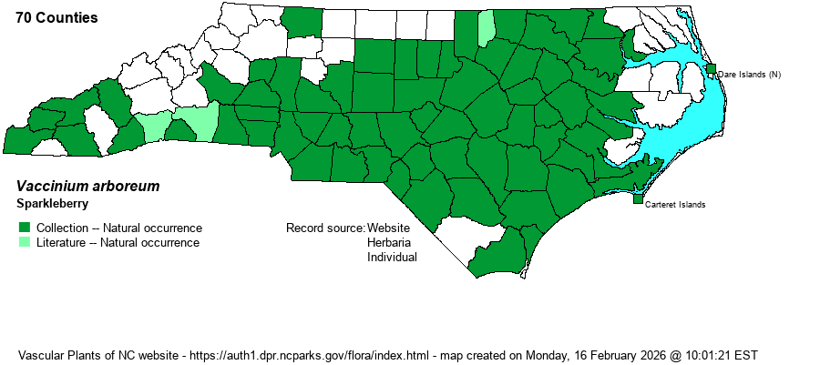 The species has a wide east-west range for an ericaceous species, ranging from southern VA and southern FL west to central TX and southeastern KS. It is absent, essentially, from the northern half of the country.