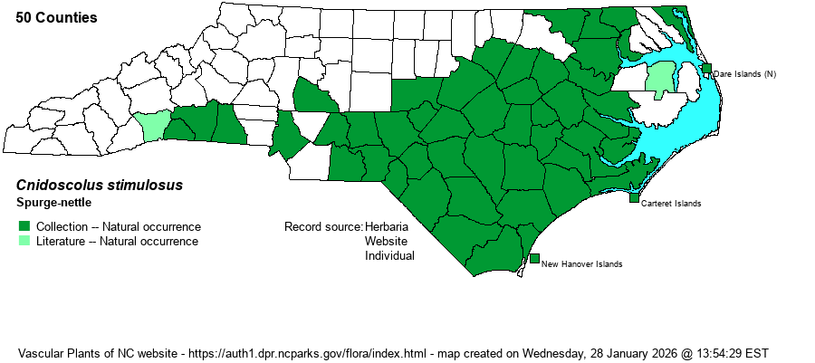 | Identification | Spurge-nettle is immediately recognized by its broad, deeply 3-lobed, and irregularly toothed leaves and its large, bright white flowers with 5 petal-like sepals (true petals are absent). Virtually the whole plant is covered with short stinging hairs, potent for up to half an hour in some people. This is an easily found species in much of the Coastal Plain and Sandhills, impossible to overlook. | |