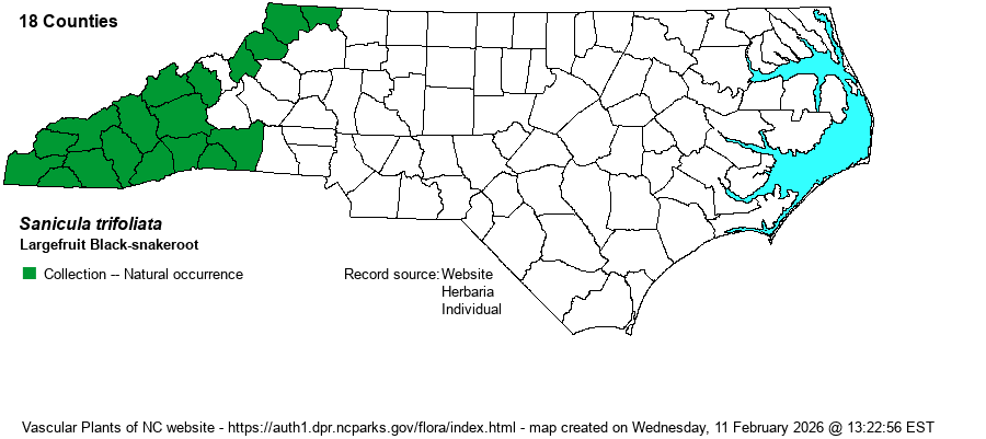 | Identification | This is a moderate-sized species, growing to 1.5-2 feet tall, generally taller than in other Sanicula species. It has palmately-divided basal and stem leaves. In this species, the leaves are clearly dissected into 3 palmate lobes, and the outer 2 lobes are strongly cleft, though not quite to the midrib. Thus, it has "3 or 5" leaflets, depending on your point of view. Each leaflet is obovate, about 3-4 inches long and about 1.5 inches wide, generally larger than in other species in the genus; as with others, the leaflet margins are strongly serrated. The very small umbels are held high above the leaves on long stalks, and the small petals are white. In this species, the fruit is more ovate to oblong than in others, and larger, often 1/4-inch tall and somewhat narrower. There are a few additional fruit characters, so check Weakley (2018) for additional details. If you are familiar with most of the other, more common Sanicula species, you should note the taller and larger form of this species, and the somewhat more tri-foliate appearance of the stem and basal leaves. | |