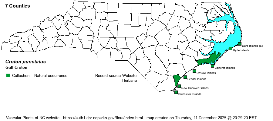 | Identification | Gulf Croton grows 1.5-3 feet tall, looking like a small shrub (though is an herb that dies back each fall) and is covered with stellate hairs, giving the plant a very pale green appearance. Leaves are ovate (with entire margins) and up to 1.5 inches wide, and the undersides have a red-brown dot at the center of each stellate hair. Inflorescences are small and in leaf axils. It has a layered, flat-topped look, generally wider than tall; and with its very pale coloration, it is unmistakable and often readily found in its dune habitats. | |