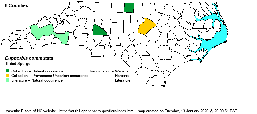 | Distribution | The southern low Mountains currently; historically scattered in the Piedmont (e.g., Caswell County -- "wooded path along Hyco River" in 1939). A specimen at NCSC from Wake County is a student collection without location data, but is accepted by taxon editors, though with questionable provenance in that well-worked county. A specimen at CLEMS from Swain County appears to be a species of Sedum and is rejected. A specimen at CATU from Rowan County has no image (Dunn's Mountain in 2000) but is provisionally accepted pending an ID check. There is a photo on iNaturalist from Buncombe County, in 2024.