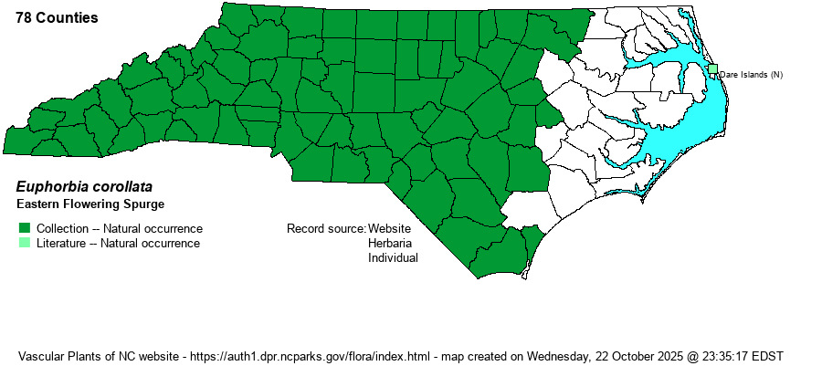 Identification | Eastern Flowering Spurge is a very familiar species over most of the state, seen nearly daily in field work. It typically grows 1-2.5 feet tall, with alternate, narrowly elliptical to lance-shaped leaves that have blunt ends; they are typically dark green above and slightly leathery. Stems and leaves are smooth to somewhat hairy. The terminal, branched, flat-topped inflorescence is showy, due to the rounded to square white floral glands/appendages. Each flower is about 1/4-inch across. E. pubentissima, generally lumped with E. corollata in earlier references, is very similar but has shorter and less showy floral glands, stems no taller than 2 feet, and stems smooth to short-hairy; its leaves are usually reflexed (vs. ascending in E. corollata), and thin as opposed to thicker and leathery. This species has many more flowers than does E. pubentissima, as well -- being a showier plant in bloom than the other, with its fewer flowers and quite short white to pink floral appendages. This species blooms mainly from June - September, whereas E. pubentissima blooms mainly from March - July (Weakley (2018). See other details in the key in Weakley (2018); note that this other species is also reasonably common in the same range as E. corollata, and thus biologists need to become familiar with each, as they should see them often. | |