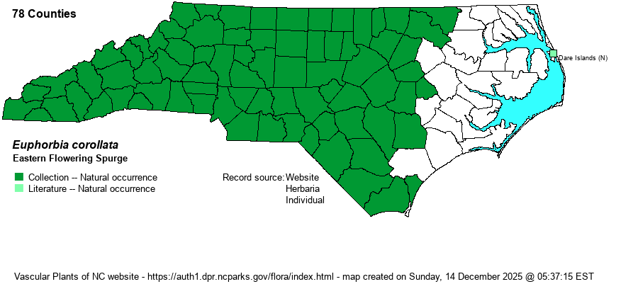 | Identification | Eastern Flowering Spurge is a very familiar species over most of the state, seen nearly daily in field work. It typically grows 1-2.5 feet tall, with alternate, narrowly elliptical to lance-shaped leaves that have blunt ends; they are typically dark green above and slightly leathery. Stems and leaves are smooth to somewhat hairy. The terminal, branched, flat-topped inflorescence is showy, due to the rounded to square white floral glands/appendages. Each flower is about 1/4-inch across. E. pubentissima, generally lumped with E. corollata in earlier references, is very similar but has shorter and less showy floral glands, stems no taller than 2 feet, and stems smooth to short-hairy; its leaves are usually reflexed (vs. ascending in E. corollata), and thin as opposed to thicker and leathery. This species has many more flowers than does E. pubentissima, as well -- being a showier plant in bloom than the other, with its fewer flowers and quite short white to pink floral appendages. This species blooms mainly from June - September, whereas E. pubentissima blooms mainly from March - July (Weakley (2018). See other details in the key in Weakley (2018); note that this other species is also reasonably common in the same range as E. corollata, and thus biologists need to become familiar with each, as they should see them often. | |