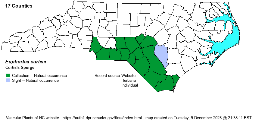 | Identification | Curtis's Spurge is a delicate green plant less than 1.5 feet tall, with widely to moderately branched upper half, these short-branched and bearing small inflorescences. Leaves are linear to narrowly lance-shape and tapered to both ends. Floral glands (resembling petals) are short and white, yet conspicuous. E. exserta is very similar in size and shape, but is overall a grayish green color, and the floral glands are maroon or red-purple. Curtis's Spurge is frequently seen in sandy pinelands, especially in the Sandhills, and though a "wispy" plant with very narrow leaves and slender stem and branches, is noticeable to an observer in sandy barrens as long as there aren't taller plant to distract attention! | |