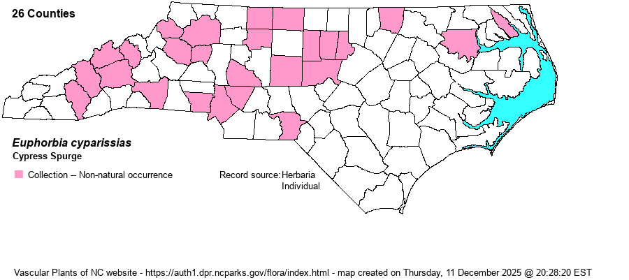 | Identification | Cypress Spurge is readily identified by its abundant skinny leaves (1-3 mm wide) and terminal, branched, rather flat-topped, yellow inflorescence. The inflorescence color comes mostly from the broad floral glands. | |