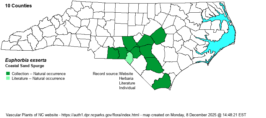 | Distribution | Sandhills (mostly) and southern Coastal Plain. The Anson County specimen came from the southern portion, where there are remnants of Longleaf Pine (Pinus palustris) ecosystem. A specimen (at CM) from Stanly County in 1929 lacks an image and needs an ID check.