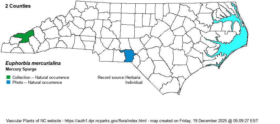 | Distribution | NOTE: Weakley (2024) now has pulled out the formerly included lower Piedmont records into a new taxon, named as Euphorbia species 5. There is, however, an apparently valid record in the Mountains (Swain County), as it is only about two counties east of the main range in TN. A report from Granville County (NCNHP) is suspect and needs checking.