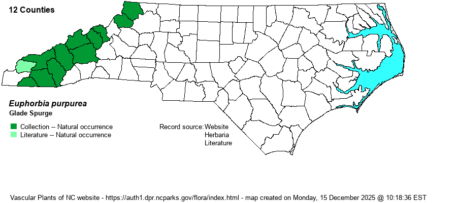 | Identification | Glade Spurge is our tallest native Euphorbia species, 1-3.5 feet tall. Stem leaves are lance-shaped with rounded tips, and smooth-margined; leaves at the base of the inflorescence branches are much broader, even rotund, and often purple-tinged. From several upper stem nodes (usually at a whorl of leaves) are a handful of long ascending stalks that bear the flowers at the tips, each one surrounded by a leafy "cup" or "hood". This normally robust and stately herb can hardly be confused with any other of our spurges, especially as it grows in such rich or moist soils in circumneutral soil, mainly in the middle elevations of the mountains. | |