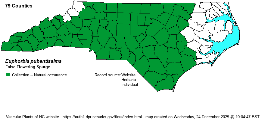 | Identification | False Flowering Spurge is certainly closely related to Flowering Spurge (E. corollata) (which see), and not all authors agree that they represent distinct species. Both can have glabrous or pubescent stems, although Flowering Spurge is seldom so. E. pubentissima has shorter and narrower (and thus less showy) floral glands, and thus a flower is barely 1/6-inch across, stems no taller than 2 feet, and stems smooth to short-hairy. It has many fewer flowers per plant than does the quite showy E. corollata, its leaves are thin and green as opposed to thick, leathery, and dark green above in E. corollata, and it has mostly drooping leaves as opposed to somewhat ascending leaves in the other species. This species blooms considerably earlier -- late March to July as opposed to June to September in E. corollata. See other details in the key in Weakley (2018). Thankfully, each species is common, or reasonably so, in the western 3/4th of the state, and botanists should see them often, even if this species is somewhat unfamiliar to many owing to taxonomic issues in the past. | |