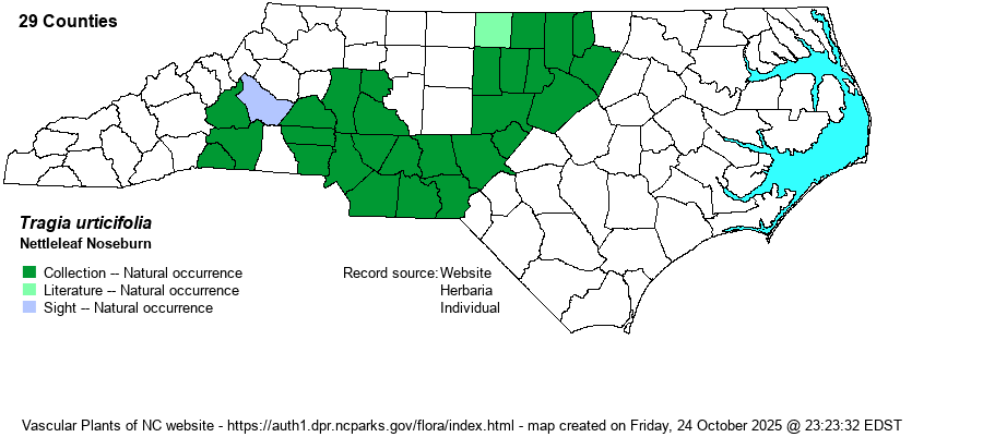 | Identification | Nettleleaf Noseburn is a small and relatively inconspicuous plant mostly less than a foot tall, with a few to several ascending branches and rather few broad based leaves (typically with a truncate base) containing abundant, sharp, marginal teeth. Leaves are sharp-pointed, triangular to ovate in shape. The whole plant has very short, translucent, stinging hairs. Wavyleaf Noseburn (T. urens) has narrower lance-shaped to broadly linear leaves that are untoothed or nearly so; the upper surfaces are darker green and leaves look leathery. That plant grows essentially in sandy soil, mostly in the Coastal Plain. Nettleleaf Noseburn is never to be expected when walking in a Piedmont glade or other site on high pH soil, but it can often be seen by carefully paying attention to small and inconspicuous plants. The numerous stinging hairs are easily noticed, especially on the rounded fruits, as are the broad-based, truncate leaves. | |