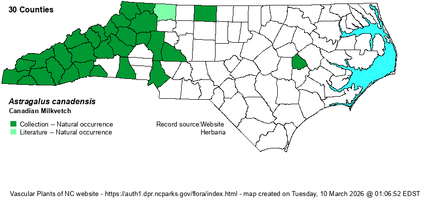| Taxonomic Comments | Many references, not surprising owing to its very large range, list several taxa within the full species. Weakley (2018) lists the nominate form -- Astragalus canadensis var. canadensis -- as the variety found in the state.