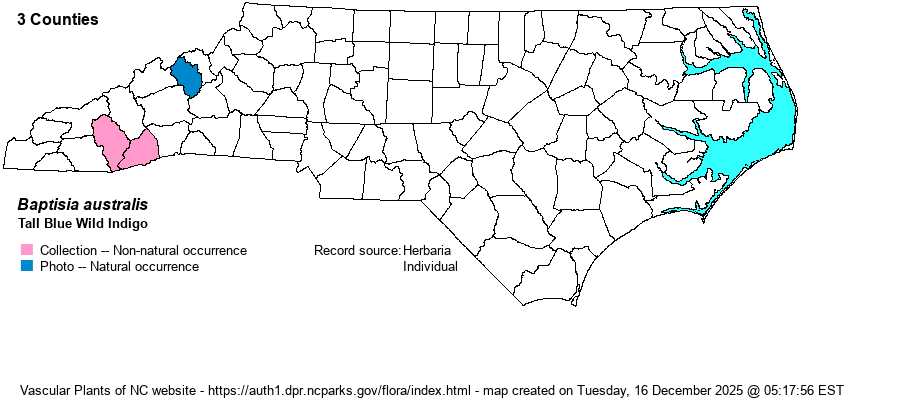 | Abundance | Very rare and limited to the Mountains. Based on the 2021 photo record from the Cane River, the website editors give a State Rank of S1, and suggest now that, as the site is in proper river scour habitat at the eastern edge of the range, it should be considered as State Significantly Rare. In 2024, the NCNHP placed the species on its Watch List, but as W4 (perhaps not native), with a State Rank of SU (Undetermined). NOTE: "blue wild indigo" species often are planted in yards/gardens and can escape to nearby habitats away from man. | |
