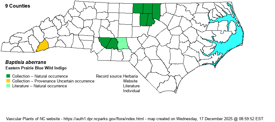 | Distribution | Primarily limited to a small area in the northeastern Piedmont -- Caswell, Person, Granville, Orange, and Durham counties. A few records for the southern Piedmont (Cabarrus, Stanly, and Montgomery counties). A specimen from Transylvania County in the Mountains may refer to an introduced population.
