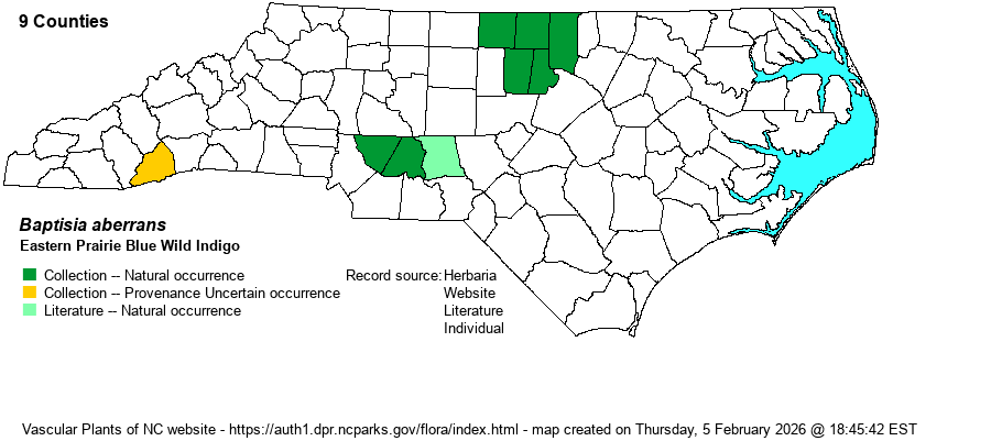 | Taxonomic Comments | This taxon has undergone so many name changes that it can be confusing to follow them! The RAB (1968) manual named it as Baptisia australis, and many references still do, often with a variety named for the NC population. Also, it has at times been included in B. minor, such as B. minor var. aberrans. Weakley (2018) has the aberrans taxon (a more easterly taxon) split off as a valid species, which this website follows.