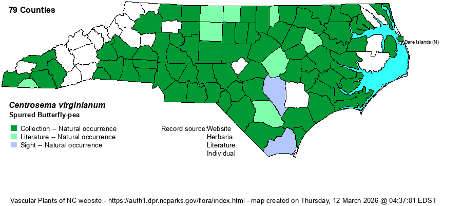 | Identification | This is a slender herbaceous vine, often trailing on the ground, but at times climbing, and reaching up to 5-6 feet long. It has alternate leaves, each containing 3 leaflets that are ovate in shape and about 1.5 inches long and about half as wide. This species shows vein reticulations on the undersides of the leaflets, to differentiate a non-flowering plant from its "cousin" -- Clitoria mariana -- which has no obvious vein pattern visible on the underside of the leaflets. When in bloom, these two should be easily separated, as Centrosema has a rotund flower (essentially the standard portion of the flower), bluish-purple to lavender-purple in color, the standard flat in profile, with a white center; this standard is quite large and about 1.5 inches across. Clitoria has the standard rolled inward (like a spoon), and the standard is usually a lavender color with a purple center. Both of these species grow nearly statewide, both are common or reasonably so, and both grow in similar habitats. Thus, it usually should not take you long to become familiar with each of these, but some people may want to be cautious in making an identification until flowers are visible, even if the plants can be identified when only in leaf by careful biologists. | |