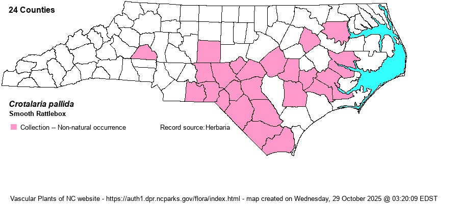 | Identification | Smooth Rattlebox is erect, and leaves are divided into 3 obovate leaflets. All other rattleboxes in NC have either lanceolate leaves that are trifoliate, or all leaves are unifoliate. The pod is conspicuously curved, versus straight in C. incana, which is not in the NC flora. | |