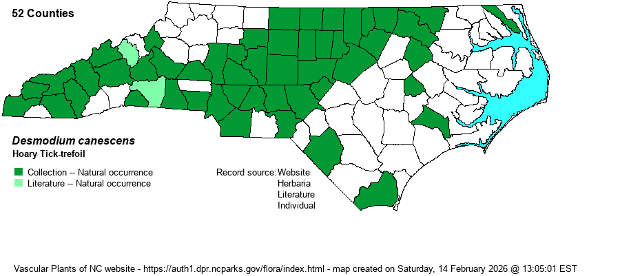 | Identification | This is probably the "bushiest" of the state's many Desmodium species. Even though it is herbaceous like the others, it often grows to about 3 feet tall (occasionally to 4 feet tall) and typically wider, with numerous wide-spreading branches. It has finely-hairy branches and stems, often also a bit sticky (glandular). The leaves are rather typical for the genus, being trifoliate, with the central leaflet being ovate and reaching 3 inches long, with the lateral ones also ovate but around 2 inches long. Quite noticeable is that the flowers usually turn greenish-blue in late bloom; the racemes of numerous (and larger than in most others in the genus) rosy-pink flowers tip the many branches. Thus, the species is normally not hard to identify, by 1) its very bushy look (often wider than long), 2) quite hairy stems and leaf petioles, and 3) flowers that turn greenish-blue in later stages. It should not be too hard to find in typical settings in most of the Piedmont or southern mountains -- woodland borders and other edge habitats. | |