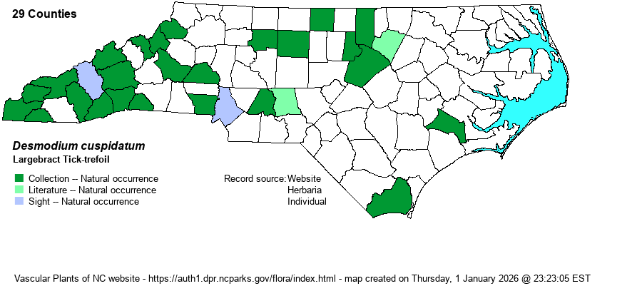 | Habitat | This is one of the few Desmodium species that shows an affinity for circumneutral soil. It favors mesic to somewhat rich soil, and is found in Basic Mesic Forest, Rich Cove Forest, and probably Basic Oak-Hickory Forest. As with most members of the genus, it is often found in wooded openings, edges of rich forests, and other areas of partial sun on high pH soil. The habitats listed in Weakley (2018) -- "Fields, woodland borders, disturbed areas" -- are incorrect and are seemingly the standard language for any Desmodium species. | |