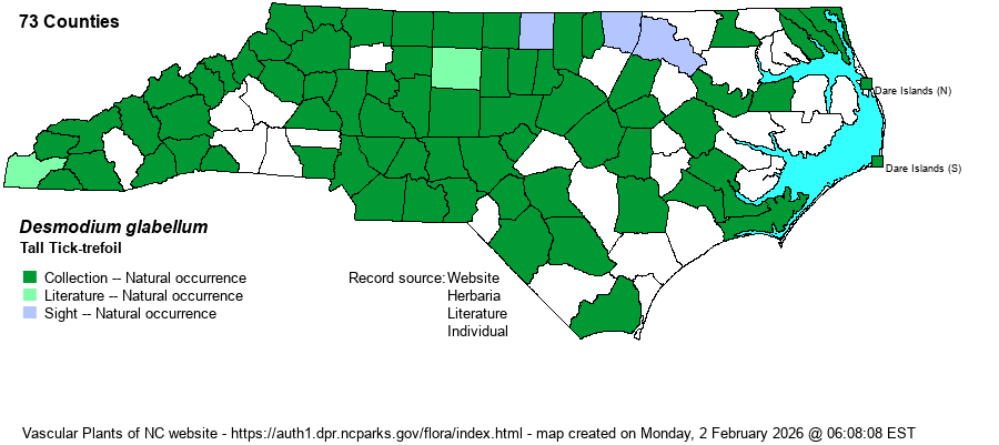 | Distribution | Essentially statewide, though as with most species of Desmodium, there has been a general lack of interest in making collections of them, and range maps are spotty and show gaps.