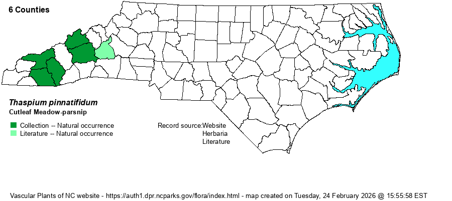 | Identification | This is the only white-flowered Thaspium species in NC, and thus this rare species needs to be carefully separated from other white-flowered umbels in other genera. It grows to about 2-2.5 feet tall, with branches in the upper portions. The basal and stem leaves are 2-3-pinnately divided, but the leaflets are quite narrow and rounded, like tiny fingers, with no hyaline margins. The 3-6 umbels are white or creamy-white in color. As this species is limited in the state essentially to high pH areas over limestone, it should not be overly difficult to identify from others, as its very lacy-leaved appearance -- almost looking like Annual Ragweed (Ambrosia artemisiifolia) -- is distinctive. | |