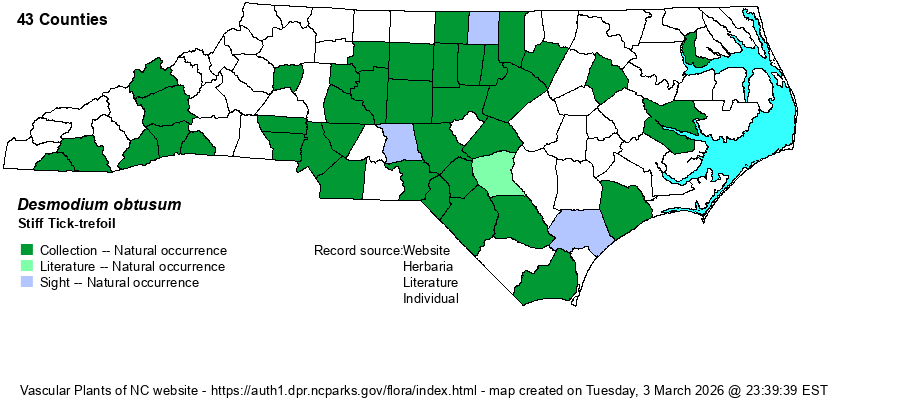 | Abundance | Uncommon to infrequent in the eastern and central Piedmont and Sandhills, but in some places can be fairly common in the Sandhills. Rare to uncommon, and certainly overlooked, in the western Piedmont, southern half of the Mountains, and most of the Coastal Plain. This is an easily overlooked species, as most biologists do not bother collecting or keying out Desmodium and Lespedeza species; it is certainly more widespread in counties than shown on the range map below. | |