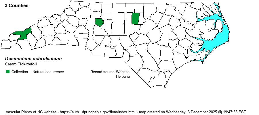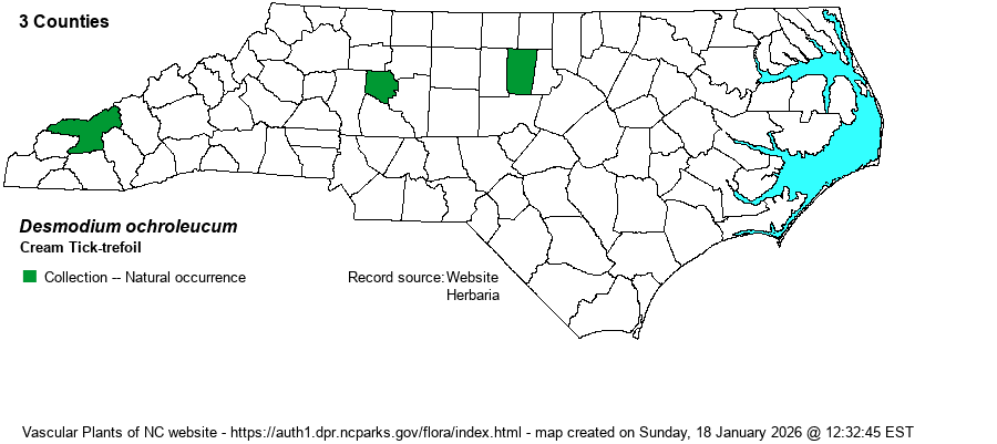 | Identification | This is an unusual Desmodium species, confusable only with the quite common D. rotundifolium in leaf. This species has a trailing stem, almost vine-like, that reaches 2-3 feet long, and it is quite pubescent. It may have a few branches, and the leaves have fairly long petioles, about 1.5 inches long. The three leaflets are somewhat ovate to diamond-shaped, with the terminal one being about 2 inches long and not quite as wide. The lateral leaflets are somewhat smaller, as in most other Desmodium species. Its most distinctive character is the flower color -- flowers are creamy to white in color, very much different from the pink to rose color of all others in the genus, and they are also quite large (about 1/3-inch across). The flowers are on somewhat erect racemes, terminal and from leaf axils, reaching 6-8 inches tall or long. As the flowers will only be present for a few weeks at best, the hairy trailing stem and the ovate leaflets are likely going to be the most useful characters for this extremely rare species. The pods are hairy/uncinate (hooked) only along the sutures, where it splits open, whereas in the similar D. rotundifolium the pods are uncinate (hooked) over the entire surface. This species has been actively surveyed for across the Piedmont in recent decades, without success. Thus, it is genuinely of historical occurrence, and discovery of a population in NC would be worthy of celebration. | |