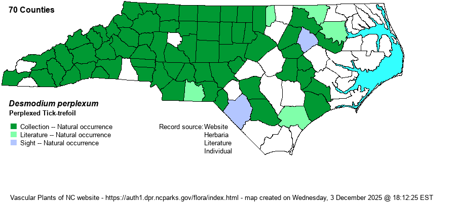 | Identification | This species and D. glabellum are the two most typical yet most difficult species to separate in NC. It has an erect stem, growing to about 3 feet tall. Unlike with D. glabellum, this species has quite densely hairy stems (pilose), including uncinate (hooked) hairs, as opposed to somewhat smooth in D. glabellum, which often has some uncinate hairs but is not densely hairy. The standard 3 leaflets are ovate in shape with rounded tips, the terminal one being 2-2.5 inches long and about 3/4 as wide; the lateral leaves are only slightly smaller. The leaf surfaces are quite pubescent as well. It has several panicles of flowers, with each flower being pink to purplish and about 1/4-inch long. This is a species you will encounter quite often over most of the state, and it and D. glabellum are usually identified first using "process of elimination", and then carefully checking the pubescence of the stem (and leaf petioles). Isely (1990) states: "D. perplexum is identified most readily by its several-segmented loments with ventrally angled articles that are combined with its usually pilose stems." He also states that for the very similar D. glabellum: "in general appearance, it usually most closely resembles D. perplexum, with which it is confluent [occurs in the same area], but typically has uncinate stem pubescence rather than the pilose inducement of the latter." Note that D. nuttallii can look somewhat similar, especially in leaflet shape, but that species has quite uncinate leaf surfaces (hooked hairs and a somewhat velvety look) so that the leaf can stick to clothing like Velcro. | |