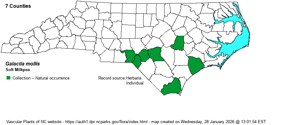| Identification | Though a number of other Galactia species are vine-like and creeping along the ground, this species is easily identified by its densely pubescent stems and especially leaves, giving the whole plant a "soft" look, which is what the common name indicates. It trails along the ground, rarely climbing, for 3-5 feet long, and has somewhat sparse leaves scattered along the stem. Each leaf is composed of 3 leaflets, each fairly similar in size and shape, being elliptical and about 1.5 inches long and about 1 inch wide, with a rounded tip. At leaf axils grow erect flowering stalks to about 6 inches high, each containing only a few flowers that are rose to bright pink, with the standard being white on the back. Each flower is about 1/3-inch long. Not only are the stems and leaves velvety-soft hairy, but so are the pods, which are about 2 inches long and obviously very pubescent. Though there are a good handful of legumes with 3 leaflets that trail on the ground, and not all simply in the genus Galactia, this one is probably the most velvety-looking, and it should be identifiable just by the leaves and stem. However, as it often grows in highly diverse sites that are frequently burned, there are likely going to be many other herbaceous species that will be taller, or more obvious as you walk through its sandhill habitat. Thus, many biologists might walk past it, unless the flowers are seen. | |