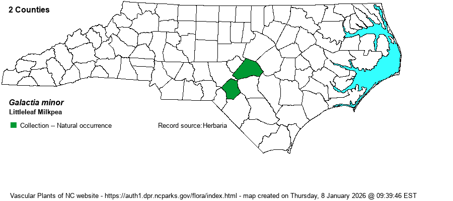 | Distribution | This entity was described as new in 1977 by Wilbur Duncan (journal Phytologia), but has been overlooked or included as part of the former Galactia "regularis" (now G. brachypoda). Thus, it is not well-known in NC. The species is, as far as is known, limited in NC to the inner Coastal Plain. The only two records known to the editors, so far, are from the Sandhills -- Harnett and Hoke counties -- but it likely occurs in other Sandhills counties.
