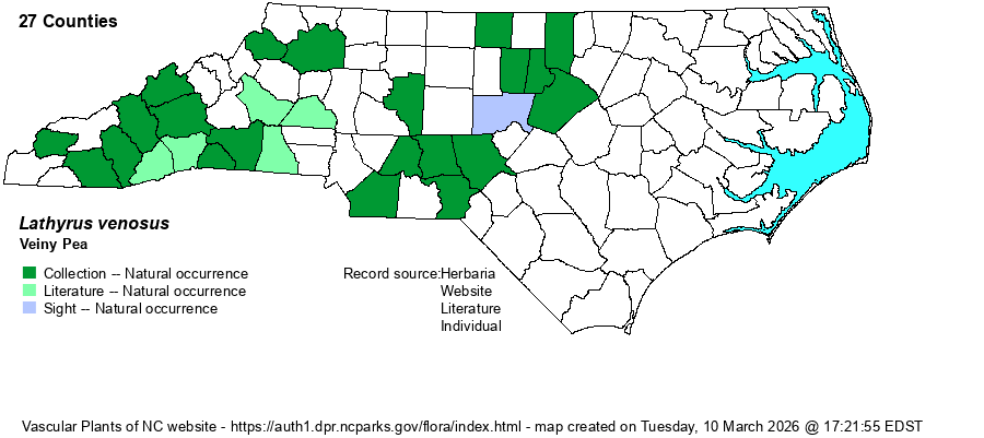 | Abundance | Rare to very uncommon over the Mountains and Piedmont. In general, very uncommon in the southern half of the Mountains, and also in the eastern half of the Piedmont, but rare in the northern Mountains and most of the western Piedmont. Not certain if this abundance level dichotomy is real (rarer in the middle of the range than at either end). The NCNHP considers this as a Watch List taxon, though it lists it under var. venosus. The editors choose not to include the variety, as there is no other variety found in the state. | |