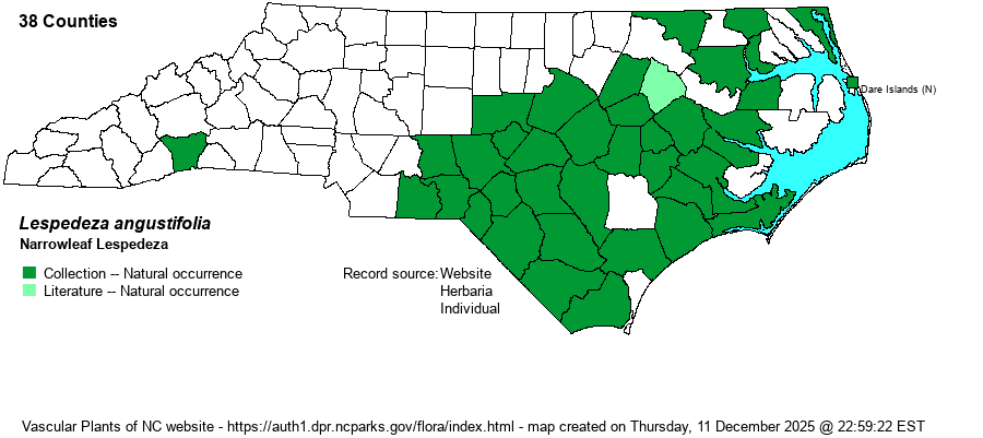 | Habitat | This is a legume of semi-wetland habitats, mostly in fairly high quality sites. It favors drier savannas, pine flatwoods including Mesic Pine Flatwoods, and sandhills-pocosin ecotones such as in the Sandhills region. It occurs in a few mountain bogs in its inland range. Prescribed fires are helpful in maintaining populations of this Lespedeza species. | |