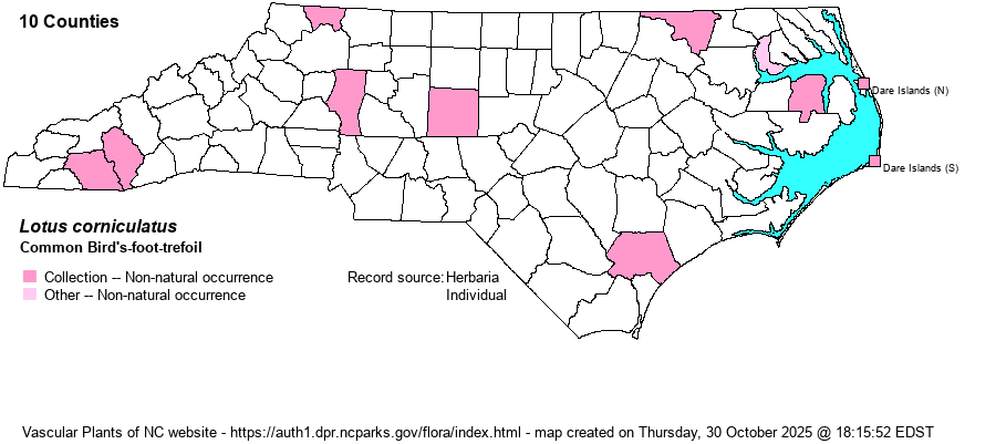| Distribution | Scattered across the state.  First collected from a pasture in Iredell County in 1937.  Apparently slow to colonize new sites.  It is possible that some NC records may refer to L. tenuis, which by some authors is only varietally distinct; specimens need to be re-examined.
