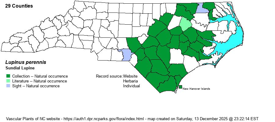 | Distribution | Present over most of the Coastal Plain, but absent in the far eastern and northeastern counties; known east to Gates, Chowan, Beaufort, and Craven counties. Also ranges barely into the eastern edge of the Piedmont. A collection from a roadside at a high elevation in Avery County is actually L. polyphyllus. A 2020 photo from Swain County on iNaturalist also is actually L. polyphyllus.. NOTE: Other montane records need vetting, as they may well be L. polyphyllus, widely used in the horticultural trade.