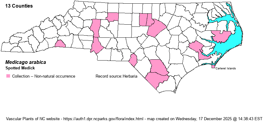 | Identification | Spotted Medick is a sprawling to semi-erect plant with clover-like leaves. The 3 leaflets are finely toothed on the margins and usually have a dark reddish or brownish spot on the blade center. The flowers grow 1-5 together, yellow. The pod is tightly curled into a ball, and spiny. | |