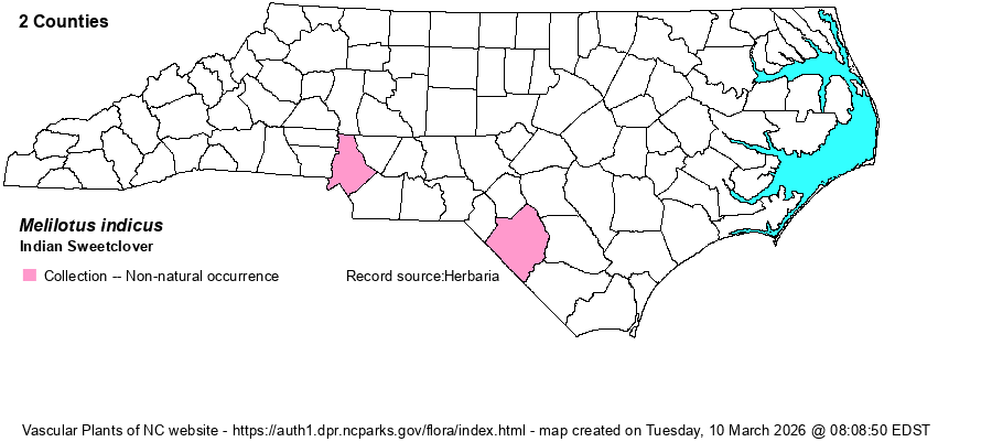 | Distribution | verified only in two locations: Robeson County, along railroad in Lumberton, 23 May 1965, R.F. Britt 3105 (various herbaria) and 2 June 1965, Britt 2057 (NCU); Mecklenburg County, football practice field Davidson College, 1982. Another specimen was collected in Edgecombe County, but there is no image nor label data (herbarium BOON), so the website editors will wait for ID confirmation. A third collection is from Cumberland County, probably at the CERL herbarium on Ft. Bragg; we withhold mapping until the specimen can be verified.