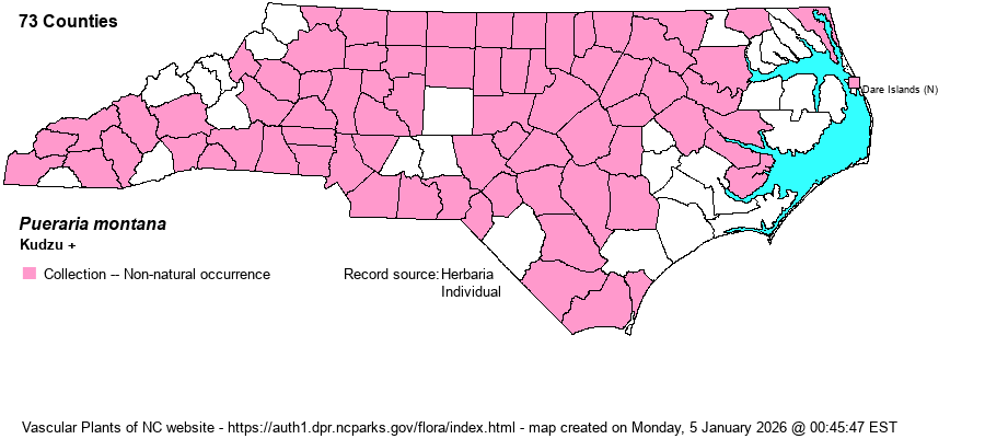 | Abundance | Frequent to abundant. Scarce in the outer Coastal Plain and in the higher mountains. Local populations can sometimes cover acres of ground and completely cover tall trees -- one of our most noxious weeds. | |