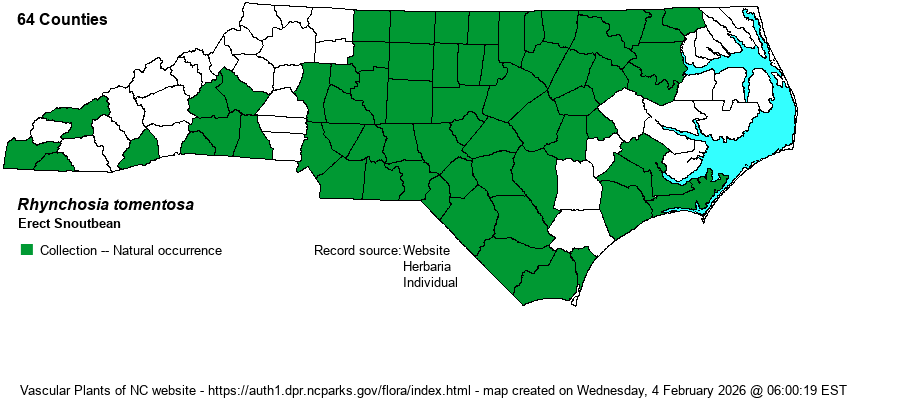 | Other Common Name(s) | Twining Snoutbean, Hairy Snoutbean. Most references use a misleading or simply "incorrect" common name, as this is not a twining species, but erect and not twining or climbing. Both Weakley (2018) and Sorrie (2011) use Erect Snoutbean, a good and quite descriptive name. NatureServe uses Hairy Snoutbean, probably as "tomentosa" means "tomentose = hairy". This website prefers to go against the majority and use the least confusing name of Erect Snoutbean, particularly as Sorrie is one of the website editors. | |