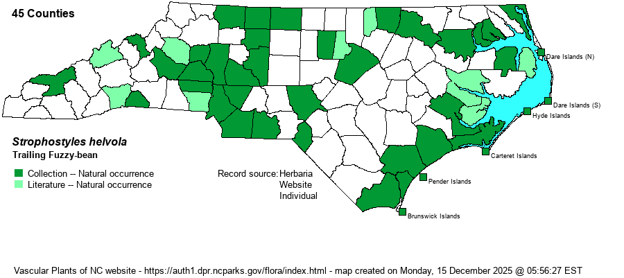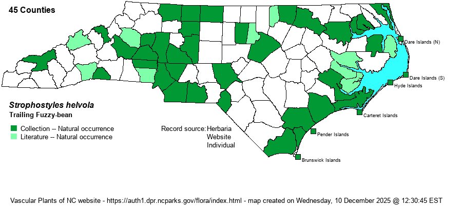 | Identification | This species and S. umbellata are quite similar, both being scattered across the state and both generally similar in appearance. Each is a slender trailing or weakly twining vine, reaching to 3-5 feet long. Each has trifoliate leaves; in this species the 3 leaflets are ovate and about 1.5-2 inches long and nearly as wide, but in this species there are usually two rounded side lobes, often only weakly developed. S. umbellata has un-lobed leaflets. Each has scattered clusters of just a few flowers in each, on very long and often erect stalks that reach 6-10 inches long, well beyond the leaves. The flower is usually bright rose to purple-rose, but can be pink to even whitish, about 1/2-inch across, with the standard upright and quite rounded, that gives each flower a circular shape. There are some characters in the bracts (bracteoles) of each species, but the main differences between the two are the leaflet shape -- mainly tri-lobed in S. helvola, which makes the leaflets wider, especially the terminal leaflet (which is more than 1 inch wide), versus an un-lobed set of leaflets and a narrower terminal leaflet (mostly 3/4-inch wide) in S. umbellata. For those who may be interested, S. helvola is an annual and S. umbellata is a perennial species. You won't have much trouble finding S. helvola along the coast, but finding it inland may be difficult, with much more likely chance of seeing it in the western Piedmont. Note that there are quite a few trailing legumes with 3 leaflets; the two Strophostyles leaflets tend to be larger than many (like Galactia) or a shinier and darker green (looking almost evergreen) than most others. Some observers may have to see flowers or fruit to be sure they are looking at a member of this genus. | |