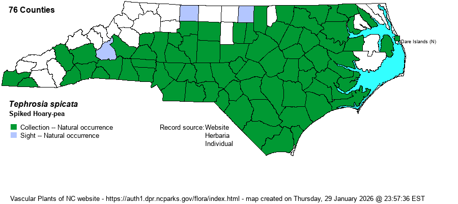 | Identification | This is an erect to leaning and quite hairy species, reaching about 1-1.5 feet tall. It has scattered leaves that reach about 5 inches long, divided into 9-17 leaflets. Each leaflet is about 3/4-inch long but about 1/3-inch wide, with a rounded tip; all parts of the leaves are quite hairy, as well. From the leaf axils grow the long flower stalks, each about 5-6 inches long, with a few flowers at the end of the stalk. The flowers are similar to the other two small Tephrosia species -- T. florida and T. hispidula -- beginning bright white but quickly turning pink and remaining deep red to carmine for a longer period; they are each about 1/2-inch long. Separating these three is fairly simple; T. spicata is the only one with strongly hairy/hirsute stem and leaves, with hairs standing straight out and not appressed; T. hispidula is somewhat glabrous but has leaflets with distinctly pointed tips, and T. florida has a flattened flower stalk (rounded in the other two) and very long leaf petioles (as compared with nearly sessile in the other two). T. spicata is often encountered on walks in drier places in the Coastal Plain and southeastern Piedmont, especially in the Sandhills in pine/scrub oak sandhills. Though not nearly as large and conspicuous as T. virginiana, it is still a very numerous species in the state (an S5 State Rank as assigned by the website editors), so why this is only given a G4G5 Global Rank by NatureServe is a mystery. Needless to say, the website editors suggest a G5 global Rank. | |