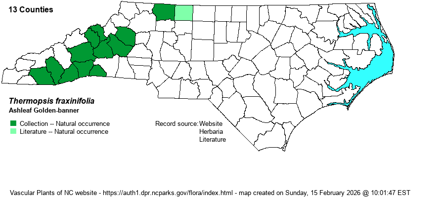 | Identification | The three Thermopsis species look quite similar vegetatively to a number of Baptisia species; they are easily separated by flower color -- yellow in all Thermopsis species and non-yellow for Baptisia species within the range of Thermopsis in NC (except for the very small-leaved B. tinctoria). Also, Thermopsis plants have laterally flattened pods versus inflated (rounded) pods in Baptisia. T. fraxinifolia is an erect and mostly smooth plant that grows to about 2 feet tall, with scattered but large leaves, and normally a few branches, so as to be as wide or wider in girth than tall. The 3 leaflets are elliptic to obovate, to a bit rhombic, and about 2.5 inches long and about 1 inch wide. The flower clusters tend to be spreading or even drooping, coming off of leaf axils or at the ends of the stem; the stalks are quite long (beyond the ends of the leaflets), and the loose racemes of large yellow flowers cover the outer 4-6 inches of the stalk. Each flower is about 2/3-inch long. The most similar species is T. mollis, which is a shorter plant (usually not much taller than 1 foot high) that grows in colonies and has terminal flower clusters that are erect or at least ascending (as opposed to horizontal or otherwise drooping). T. villosa is a much taller and erect plant, often 3-5 feet tall or more, essentially without branches, and a strongly erect terminal raceme. This is a strikingly beautiful plant when in bloom, owing to the long and often drooping clusters of bright yellow flowers, especially growing in such dry and rocky places where few other showy herbs might be found. Sadly, it is a rather rare species, and you might not be able to discover a population on your own, and thus may need to visit known sites in protected natural areas. | |