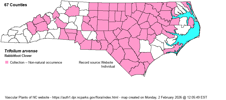 | Taxonomic Comments | Trifolium is a large genus of some 240-250 species globally, mostly north-temperate zone. Most are readily recognized as a clover by their 3 broad leaflets and globular to hemispherical head of densely-packed flowers. Flowers vary from white to pink, and red; the hop clovers have tiny yellow flowers. Some species were introduced for their forage value for livestock, others hitched a ride with hay, packing material, etc. Our two native species -- T. carolinianum and T. reflexum -- have suffered great loss of habitat and are now rare. | |