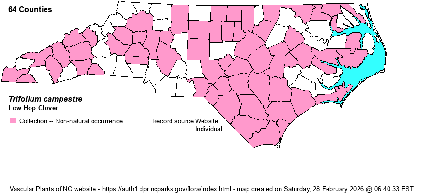 | Identification | Low Hop Clover is a short, sprawling plant with small heads of tiny yellow flowers. The standard has 5 diagonal veins versus none or indistinct in Suckling Hop Clover (T. dubium), and the heads have 20-30 flowers (vs. 10-15 or so flowers in dubium). Both species are common in the state, so you have ample opportunity to check out the field marks and learn to distinguish them. | |