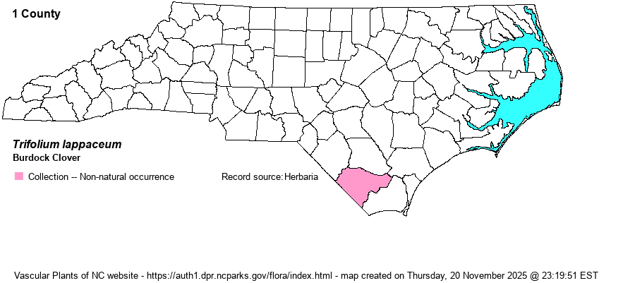 | Identification | As its name suggests, Burdock Clover has a globose inflorescence a bit like a fruit of burdock (genus Arctium), due to the projecting, acuminate, calyx lobes. | |