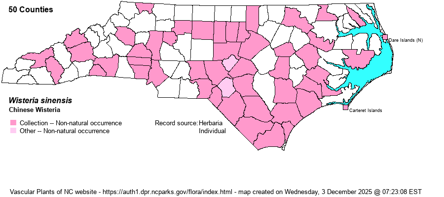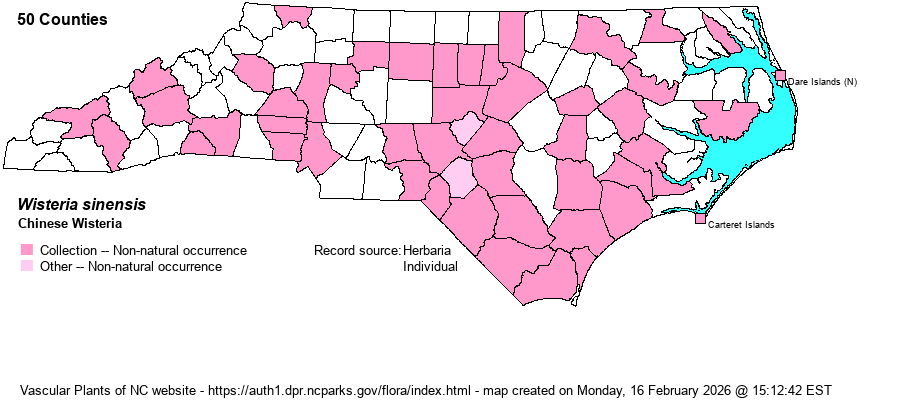 | Distribution | Occurs throughout the state. Website editors have not checked the ID of these specimens. It is likely that some of these collections may be W. x formosa, a hybrid cultivar between Japanese (W. floribunda) and Chinese Wisterias. See Weakley (2018) for information.