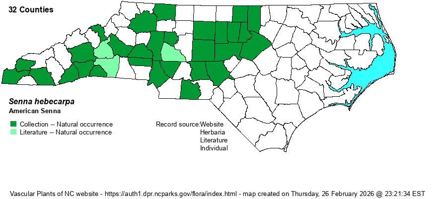 | Identification | This is one of two native species in the genus Senna that were formerly in the genus Cassia, with some other obviously different species. This is a fairly tall and robust species, growing erectly and to about 3 feet tall, rarely to 5 feet tall. Though essentially unbranched, it has very long leaves that make the plant appear branched and bushy. The leaves can be 10-12 inches long, and they are highly divided into 10-20 fairly large leaflets. Each leaflet is roughly elliptic and about 1.5 inches long and about 0.5-inch wide, thus about 1/3rd as wide as long. (S. marilandica is essentially identical in these features.) In this species, there is a small somewhat club-shaped gland in the leaf axils, and this gland has a slightly narrow stalk (barely visible); in S. marilandica, these glands are rounded and essentially sessile. However, this is a very tricky field mark, in that the stalk is hard to see, and it is easy to call a Senna species as S. marilandica by this character when in reality it may be S. hebecarpa. The inflorescences of both species are also extremely similar; each has showy clusters of racemes in axils and at the summit of the stem. These flowers are quite large, bright golden-yellow and about 1 inch across. (There might be slight differences in the flowers or pattern of inflorescences, but these are not mentioned in various keys.) To be certain, you must have the pods present, and it is better to have some familiarity with one or the other species to feel comfortable. The pods of S. hebecarpa differ in three ways: 1) they are quite narrow, from 5-8 mm wide (about 1/4-inch), as opposed to 8-11 mm wide (about 2/5-inch) in S. marilandica; 2) it is quite hairy overall (especially at first), as opposed to mostly glabrous in S. marilandica; and 3) the many segments of the pod are square-shaped (about as long as broad), as opposed to rather narrow (wider than broad) in S. marilandica. It should be mentioned that the shape of the pod segments can be tricky to judge without familiarity with both species, and the hairiness of the pods of S. hebecarpa can depend on fresh or old pods. Also, pods that are rather immature are obviously going to be smaller than when mature, and thus a developing pod of S. marilandica, when measured, may well be less than 8 mm wide. Thankfully, neither species is truly rare in the state, and ranges are somewhat similar, and thus mistaken identity when in the field is not overly critical, other than collecting one for an herbarium and getting the incorrect identification. However, it is quite important in establishing new county records for each. Field biologists often run across a few of these two species annually in their work, such as along greenways while walking in bottomlands, or along wet thicket margins; when in bloom, they are absolutely impossible to overlook. But, you almost certainly should re-visit the site(s) later in summer or fall, and identify the plants by the pods and not by flowers or glands. | |