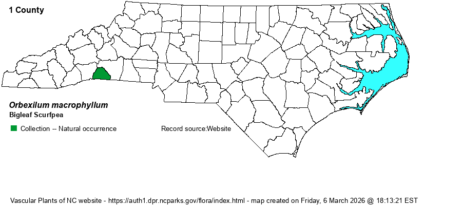 | Distribution | Considered to be extinct. The only records anywhere (in the world) were from the Tryon Peak and/or White Oak Mountain area of Polk County, along the Blue Ridge Escarpment. It was first seen in 1897 and collected again in 1899, and never found again, despite many more recent searches in that area. Though definitely a good species, its placement in the genus Orbexilum (formerly Psoralea) is presumptive based on vegetative and floral characters, as fruits are unknown (according to Isely 1990). | |